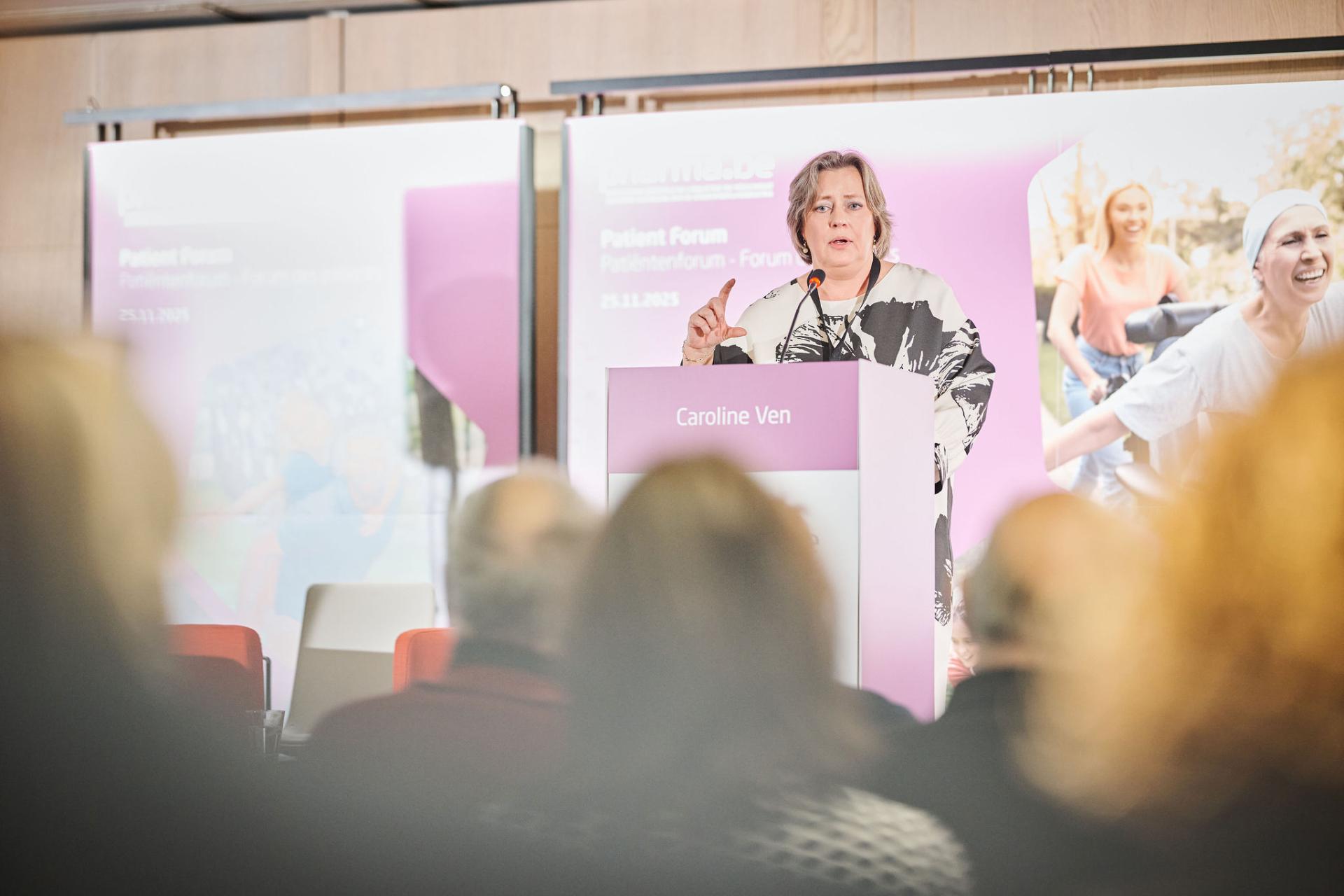 Caroline Ven (CEO, pharma.be) verwelkomt de deelnemers en benadrukt het belang van samenwerking tussen alle actoren in de gezondheidszorg om de stem van de patiënt te versterken. Zoals vermeld in ons memorandum zullen we mee aan de professionalisering van de patiëntenorganisaties werken.